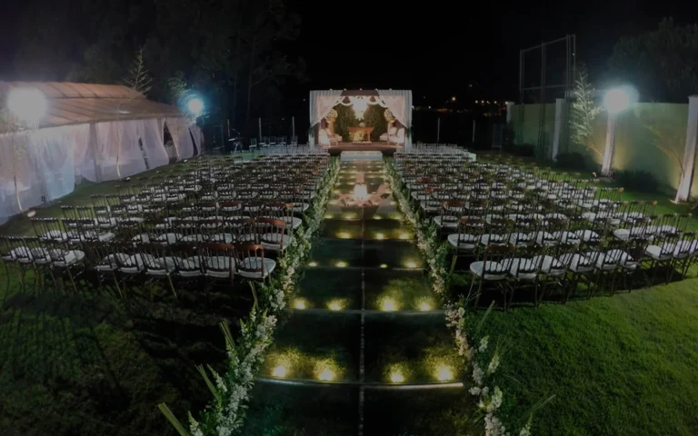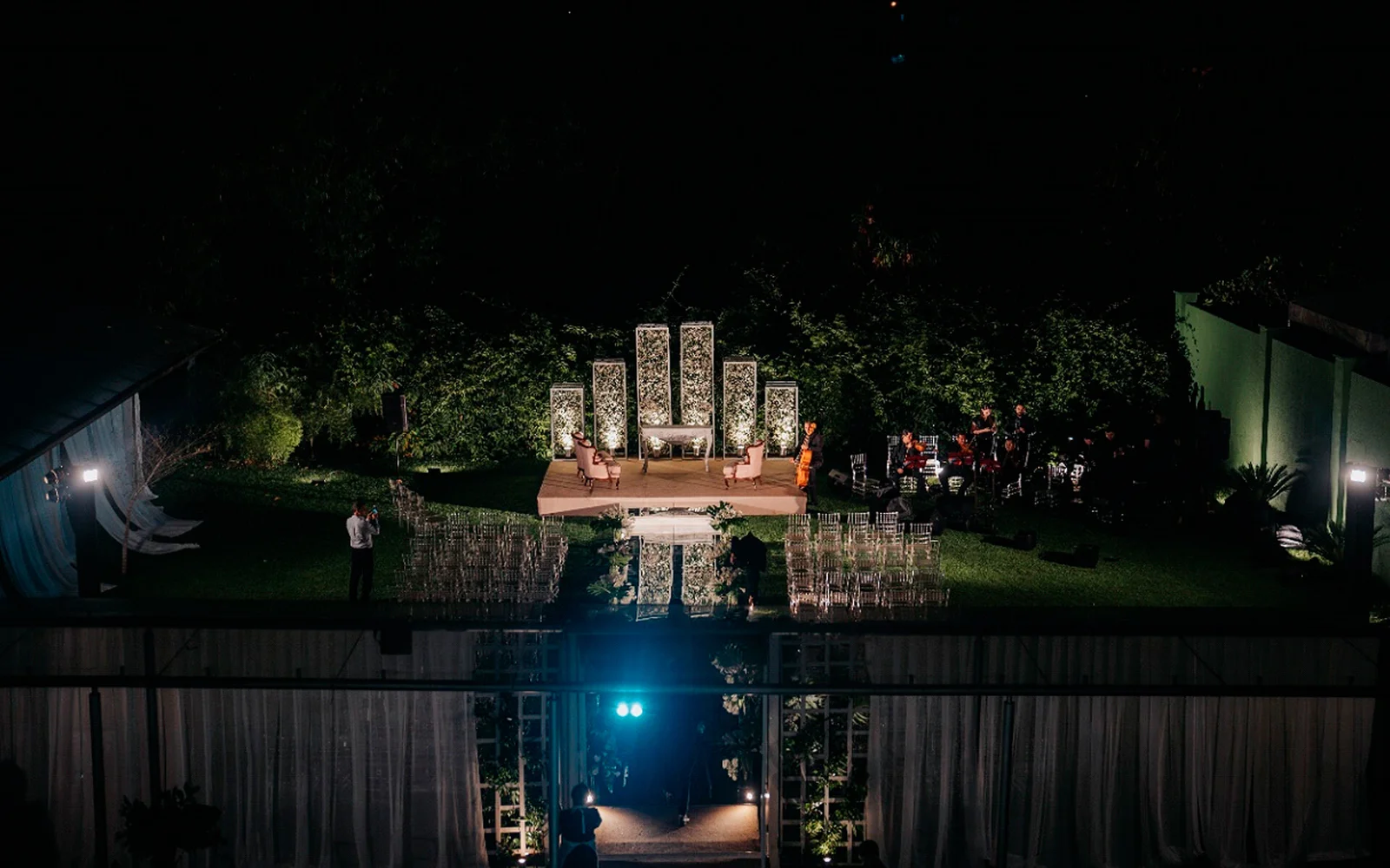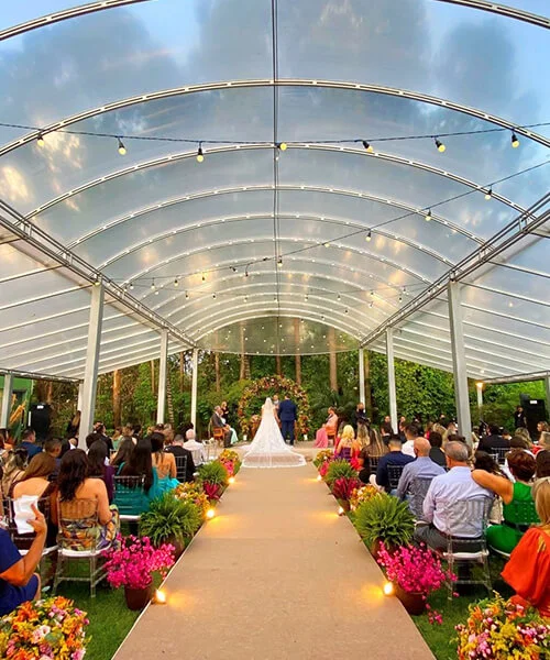 Aqui você conta com 2.600 m² de área verde, além de uma grande tenda cristal que torna o seu evento ainda mais bonito e confortável, seja com sol ou chuva.
